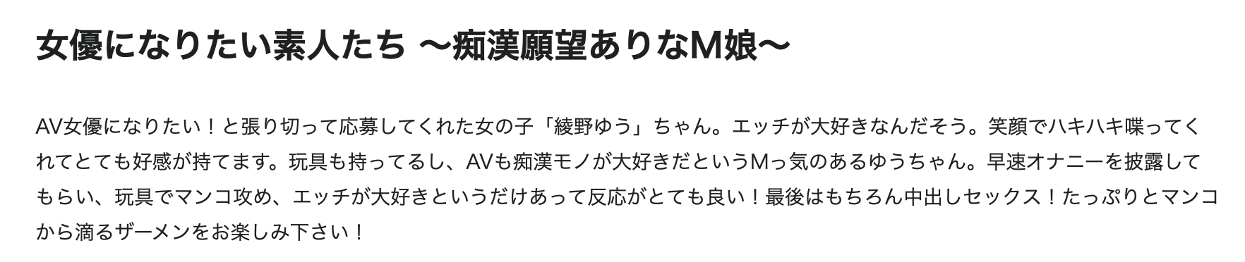 2023 年 4 月 19 日AV消息 【新聞】【八卦】解密!那位在無碼片商Heyzo出道的「綾野ゆう(綾野悠)」是誰?之前拍過無碼嗎? … 哇靠,這比神雕俠侶還有一對大喇叭更令人驚訝,無碼片商Heyzo竟然有女優出道(AVデビュー)呢! 她叫「綾野ゆう(綾野悠)」,作品說明寫得很清楚,這位女優是「初撮影(第一次拍片)」,條件一流、有著修長美腿的她一直很想大幹一場,什麼馬 […] 閱讀全文
