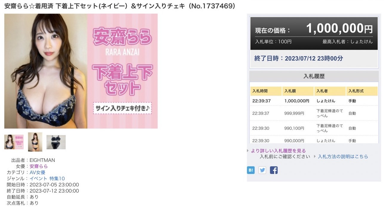 這價格很顯然已經有人搶到失心瘋了,這不但顯示出安齋らら(安齋拉拉)凌駕於其他女優的實力也顯示出她影迷財力的雄厚(加起來賣了550万円啊哇操),真的,可惜她就是不演不辦活動,否則她得到的不只是濃濃的神秘感,肯定是不下於三上悠亜的各式商演邀約滾滾而來⋯